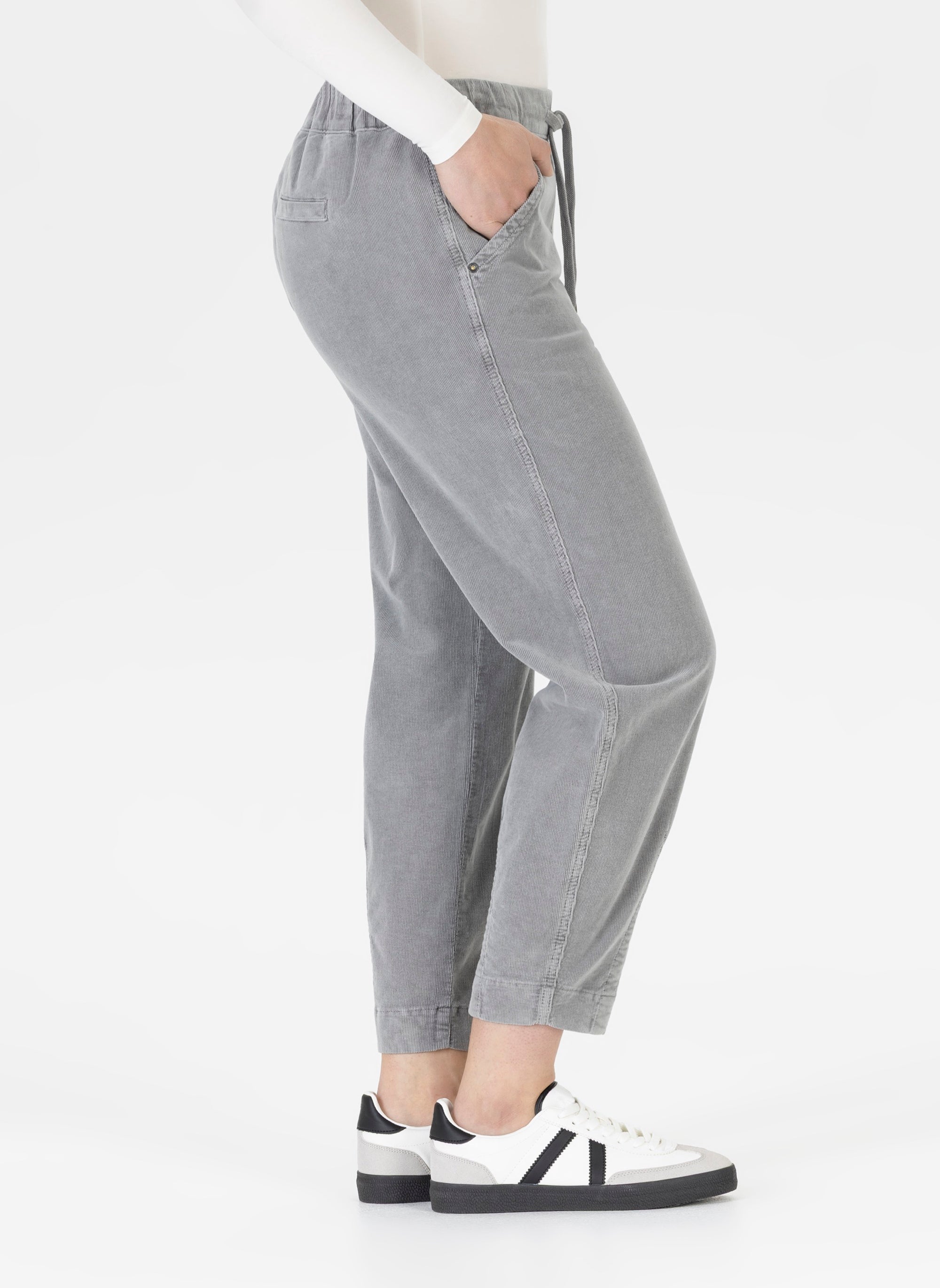 Our Barrel trousers impress with select materials such as soft cotton blends , corduroy, and high-quality denim, which feel comfortable yet are durable. A touch of stretch ensures noticeable freedom of movement in everyday life and supports the characteristic O-shape silhouette without losing its shape. Elasticated waistbands and comfortable rises further enhance comfort, making them ideal for long days juggling the office, family, and leisure activities. At the same time, high-quality fabrics guarantee shape retention and durability , ensuring the Barrel trousers retain their shape even after numerous washes. Breathable qualities also make them a versatile companion throughout the year.