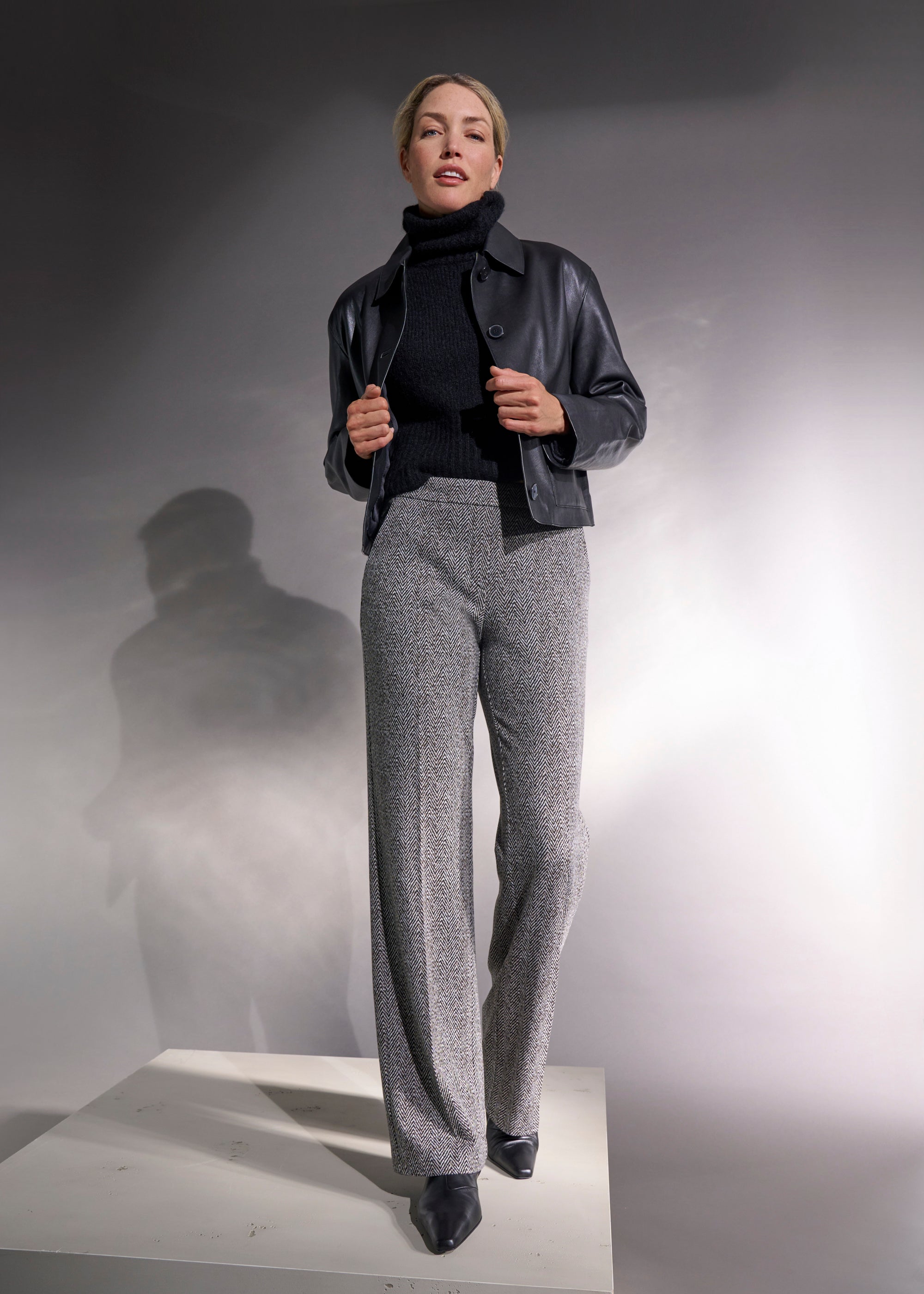 - Im Büro: How about a casual layering look? Combine black pull-on pants with a white blouse and a blazer on top. Elegant loafers complete the casual style.